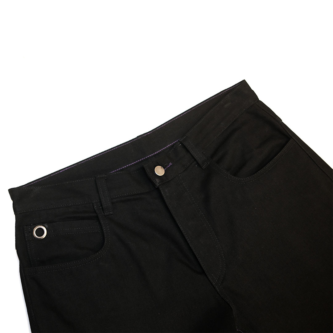 - Contrast stitching on inseam, underside waistband, and keyholes